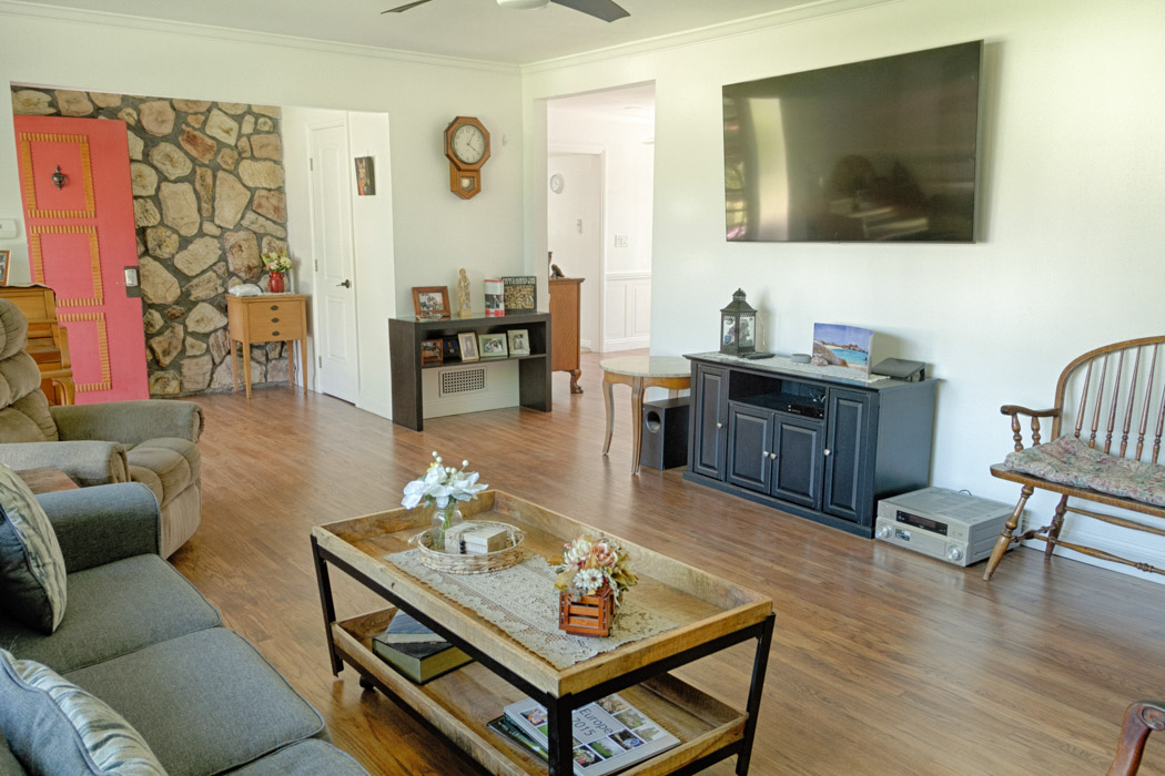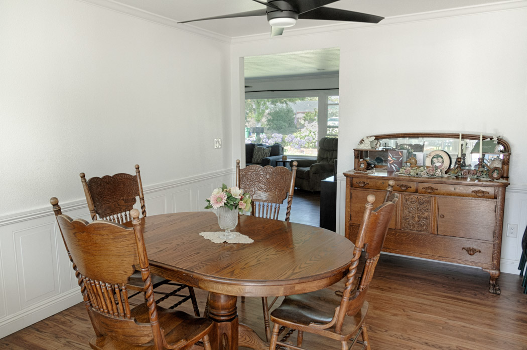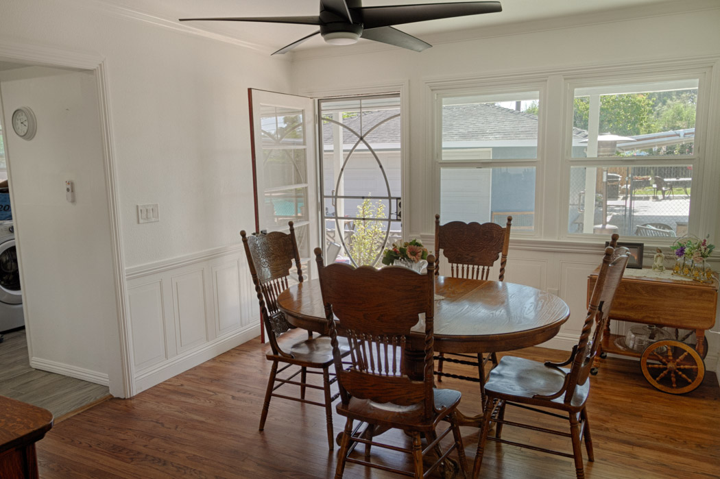 Dining Room with wainscot, oak floor, led lighting, new Milgard windows.