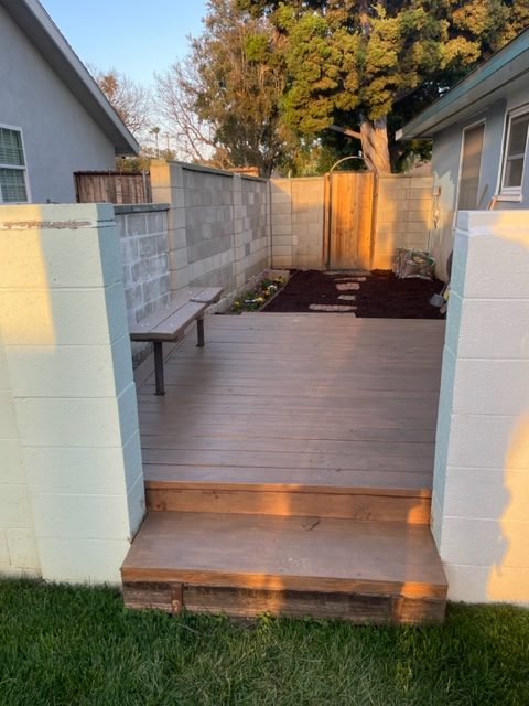 This is the beautiful deck area outside of Bedroom 2. Access the yard and pool area, exit the gate, or enjoy the small private garden flower area, next to the deck. Sit on the bench, or add your adirondack chair and enjoy.