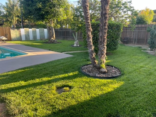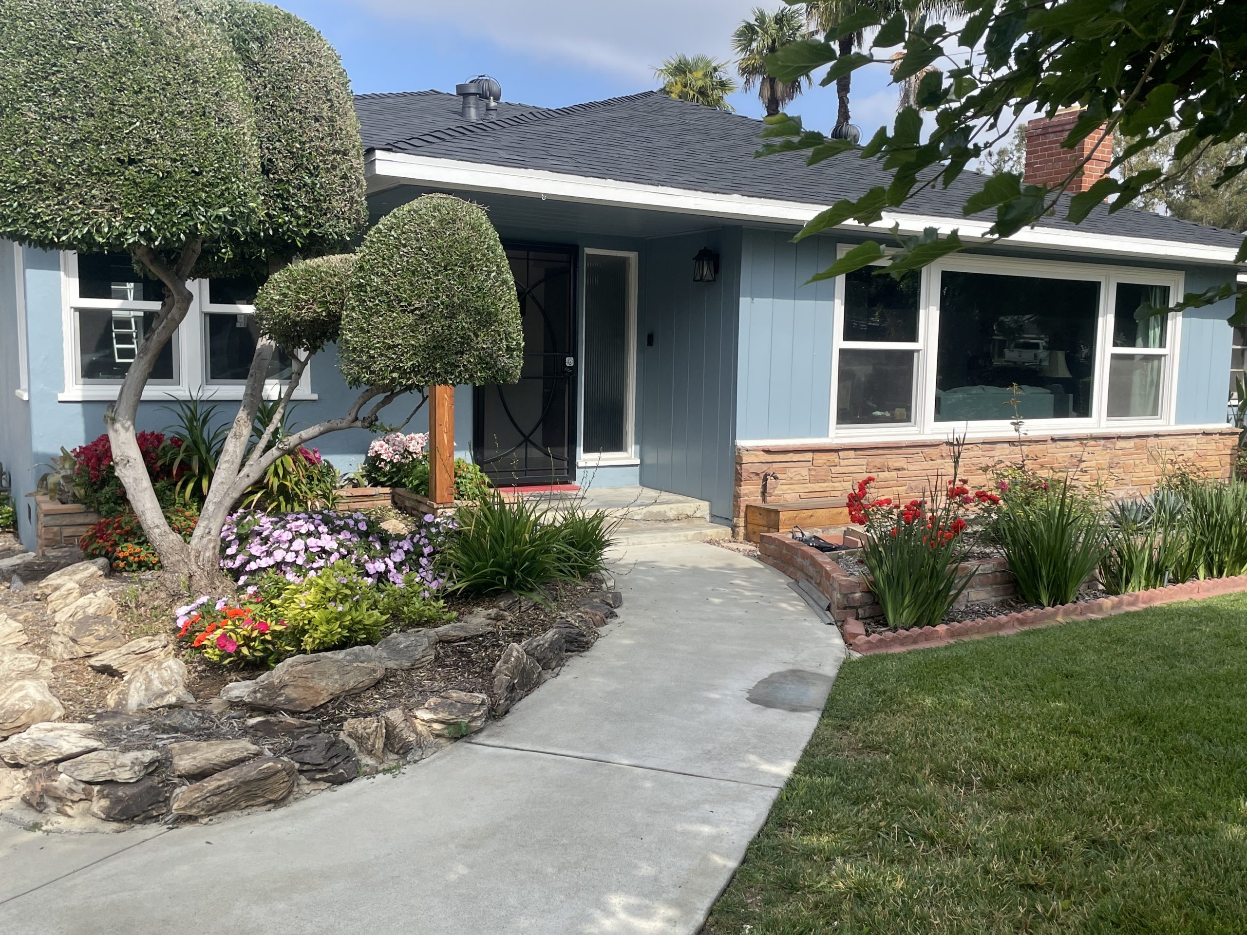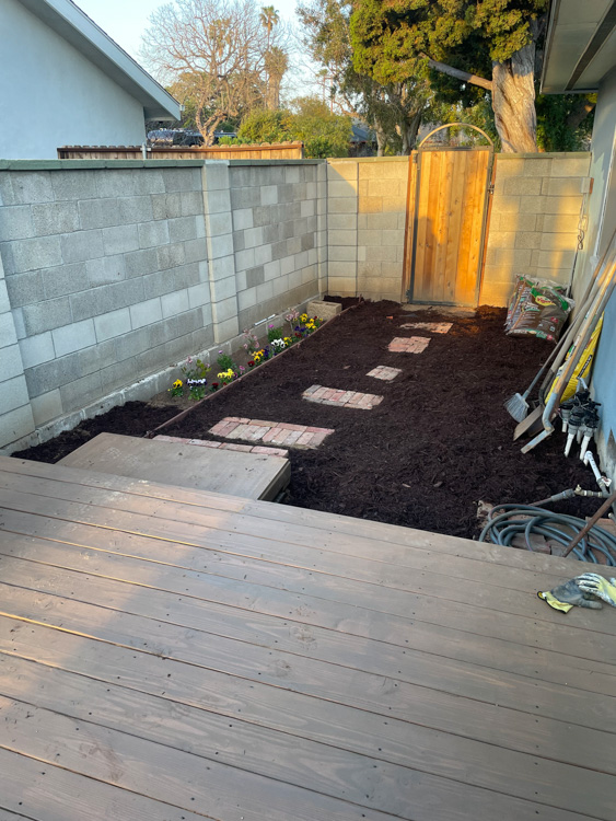 The dirt was dugout of the flower beds. The rocks were reset, the bricks were repaired, new soil along with automatic sprinklers, and water drip system installed.