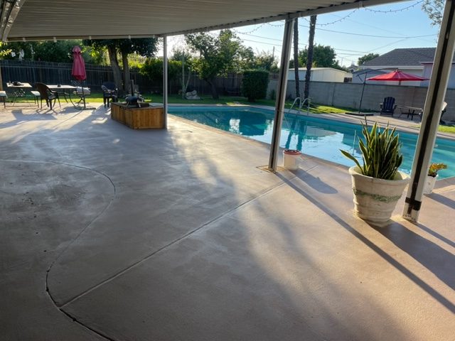 The pool deck area under the awning.