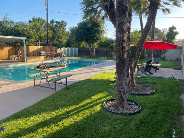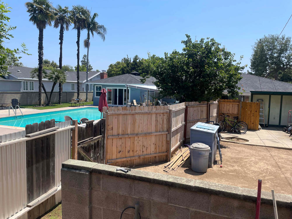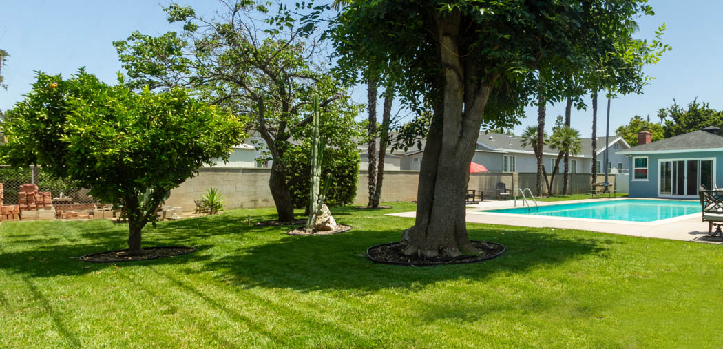 Grass area behind pool is approximately 30 feet by 70+ feet. Orange Tree, cactus – bearing prickly pear fruit, palm trees, large shade tree. Behind the green vintage fence is the garden area, behind the regular fence is a work area. Approximately another 1,400+ square feet.