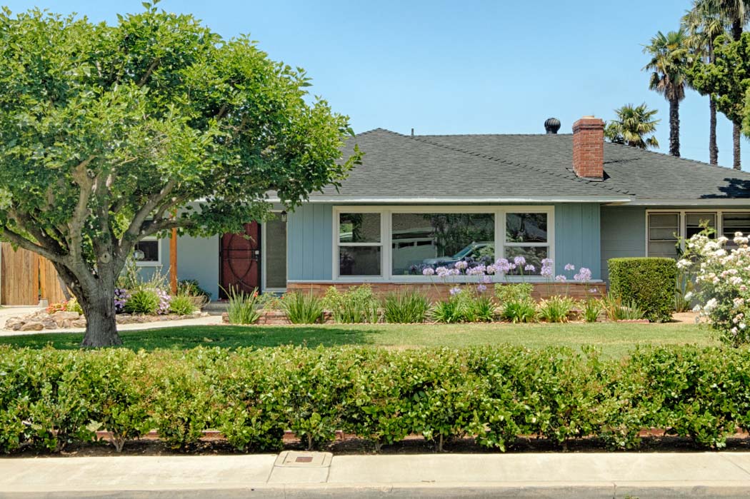 Front of house sits on a wide street, approximately 50 feet from the curb. A beautiful hedge at the front of the property helps give privacy.